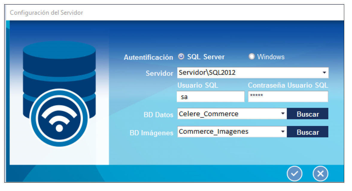 Aparecer la pantalla "Configuración del Servidor" la cual permitirá indicar el nuevo servidor o base de datos a utilizar: