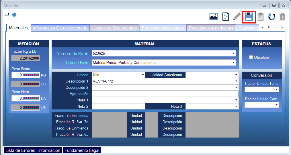 5.- Una vez guardado, buscar el código dado de alta previamente y dar clic en la pestaña de "Fracciones Mexicanas".