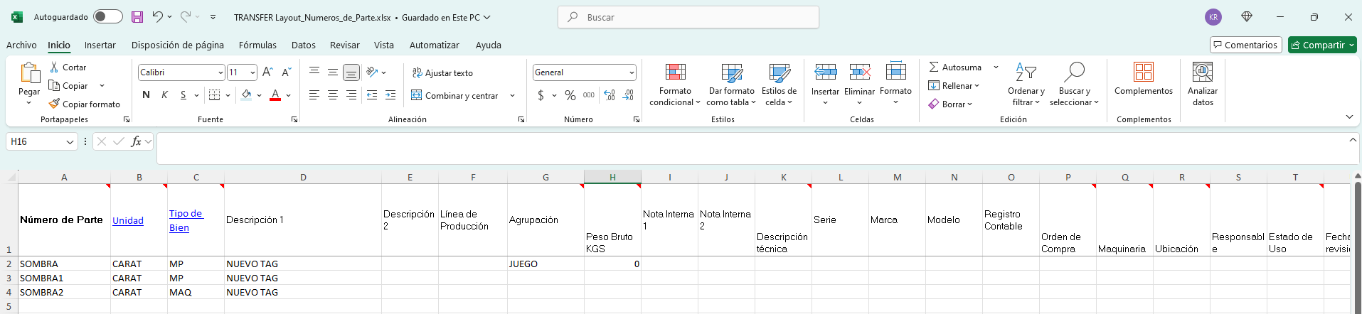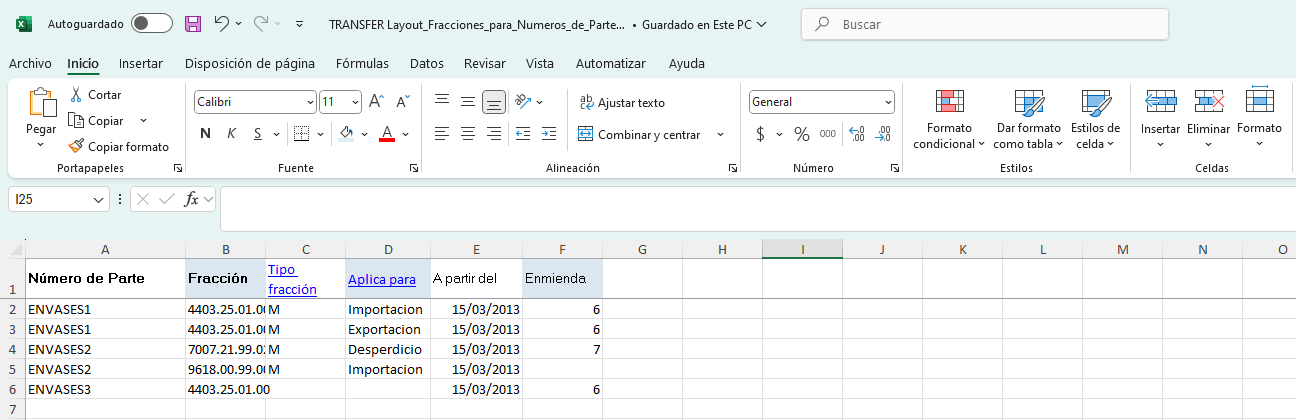 El/los layouts a utilizar tienen el nombre "TRANSFER Layout_Numeros_de_Parte", "TRANSFER Layout_Fracciones_para_Numeros_de_Parte"