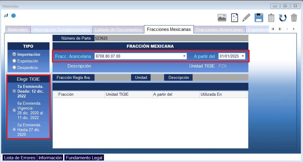 IMPORTANTE: Cada vez que se da de alta un número de parte se debe asignar la fracción arancelaria en catálogo ya que, en caso de alguna auditoría puede ser un campo observable.